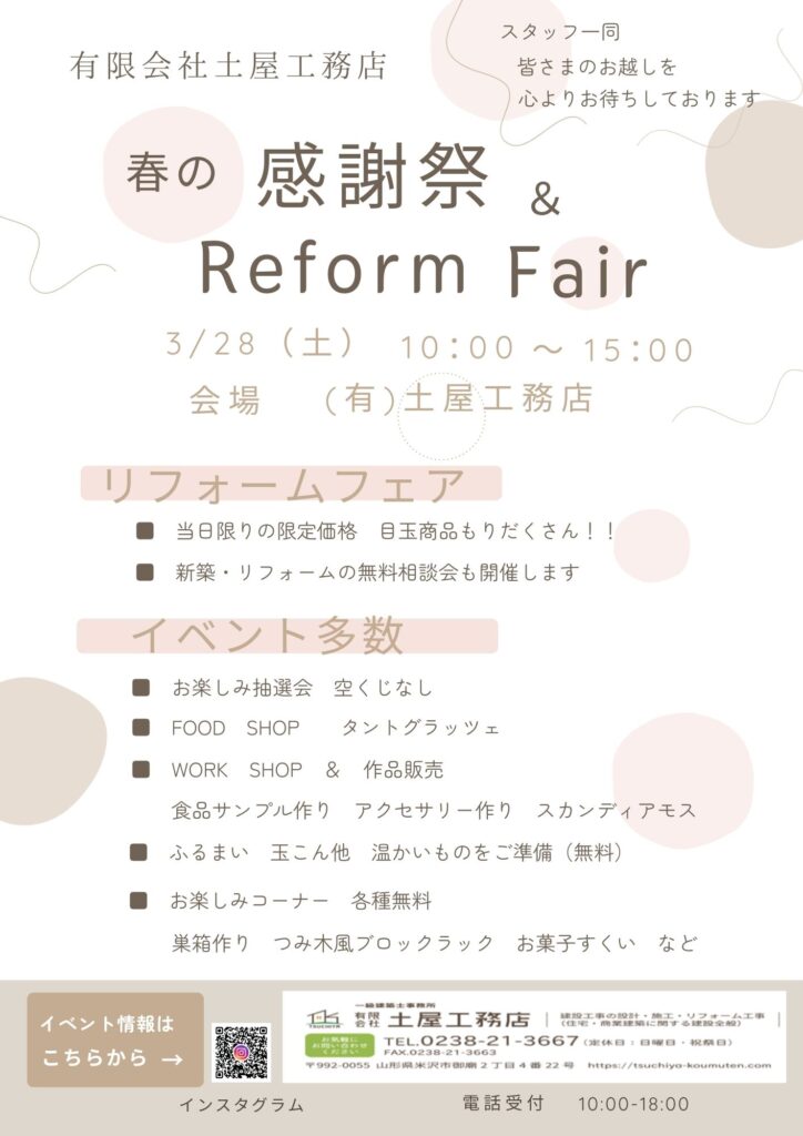 日頃の感謝を込めて、3月28日(土)【 春のお客様感謝祭&Reform Fair 】を開催いたします。